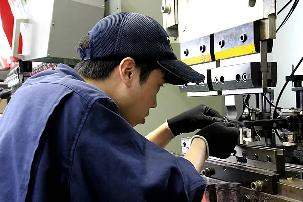 私は曲げ工程の部署にいます。曲げる方向、順番などを考え金型のセットをして曲げ、図面通りの寸法が出たとき「やりがい」を感じます。